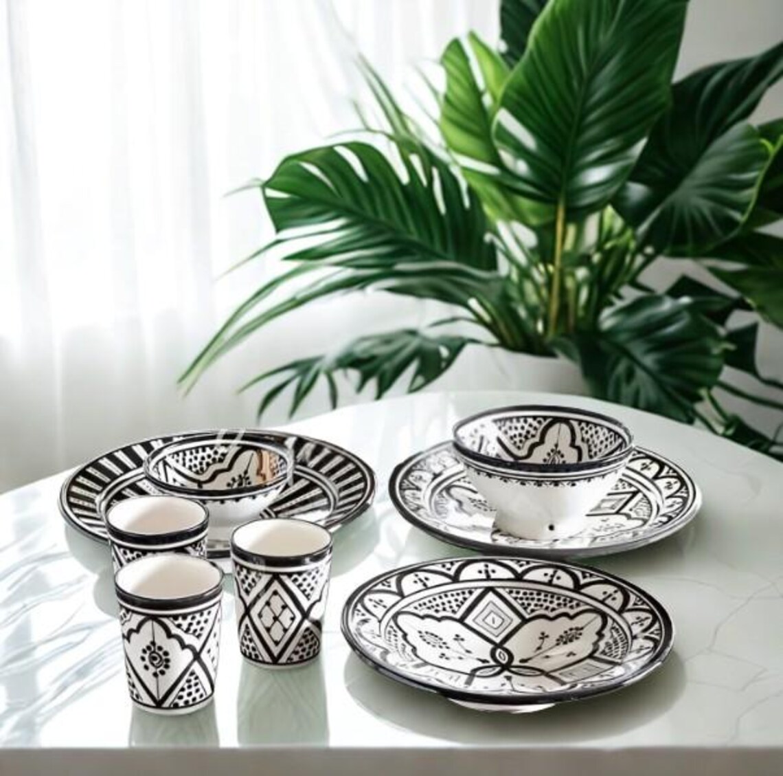 This curated dinnerware set gathers the best of Safi's black-and-white ceramic tradition into one cohesive collection. Mixing floral and geometric patterns, the set creates a dynamic, visually rich table setting that is unmistakably Moroccan yet thoroughly contemporary. Each piece is hand-painted, so the set has a collected, artisanal feel.